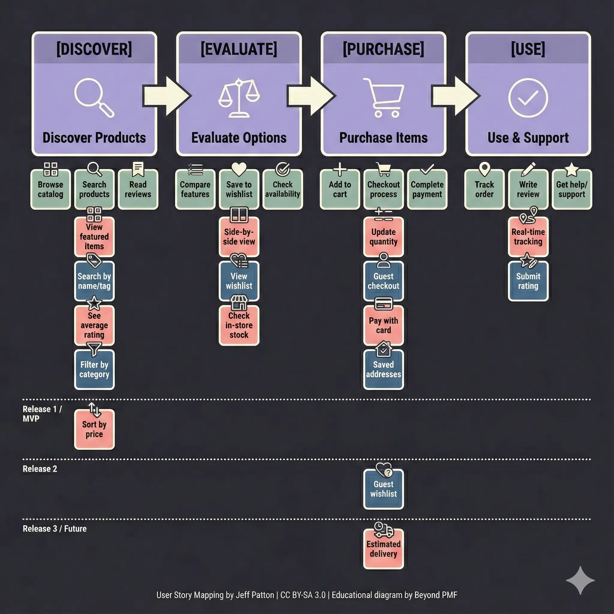 Define the goal: Identify the main objective of the product or feature. | Create a backbone: List the main tasks or activities users will perform. | Map user stories: Break down the main tasks into smaller, actionable user stories. | Prioritize stories: Arrange user stories by their importance and dependencies. | Slice out releases: Organize stories into releases based on priority and logical grouping.